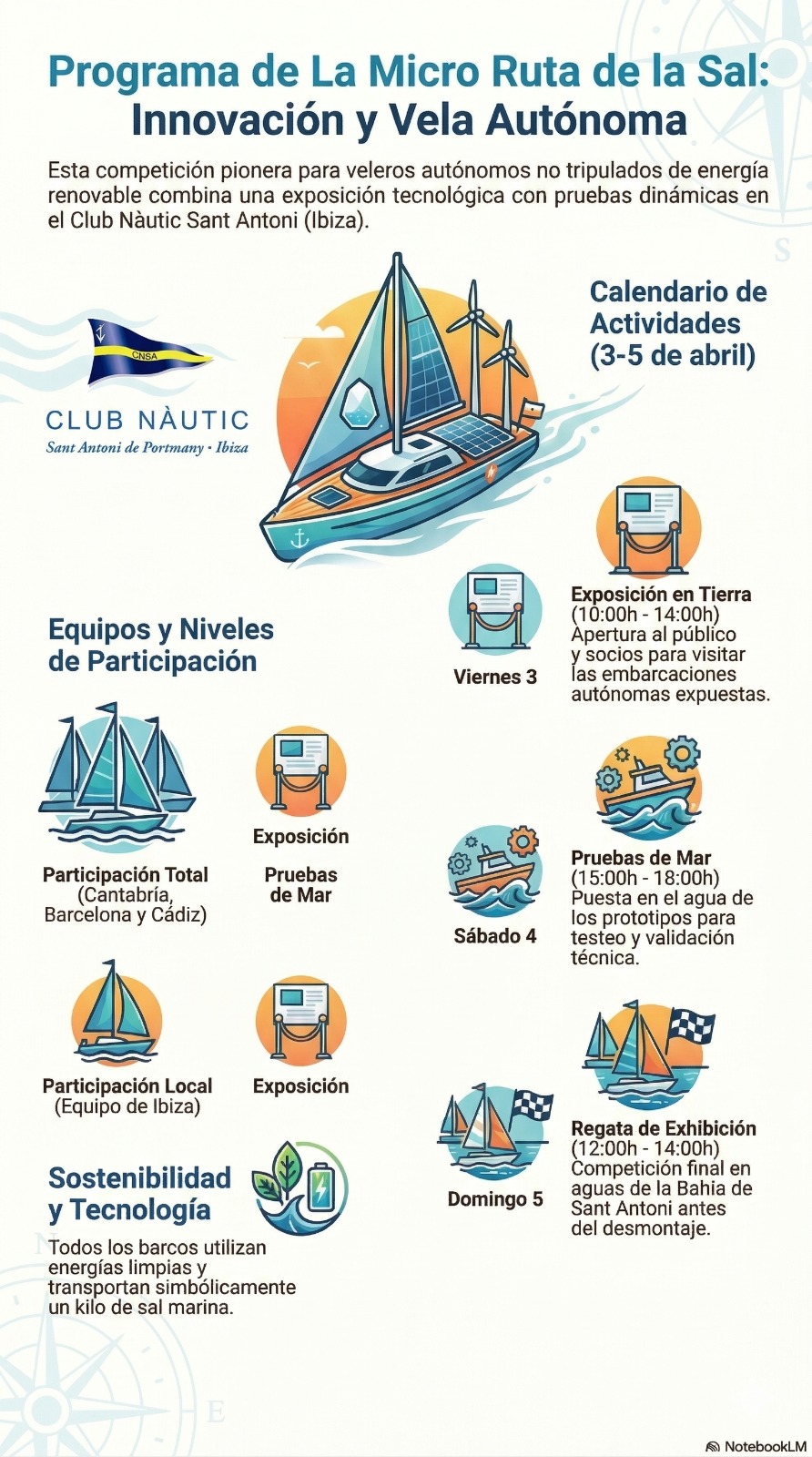 Desde hoy, viernes, hasta el domingo el Club Nàutic Sant Antoni vive unas jornadas muy especiales gracias a la presencia de La Ruta de la Sal, que trae como gran novedad La Micro Ruta de la Sal, la primera regata internacional para veleros autónomos no tripulados de larga distancia.
