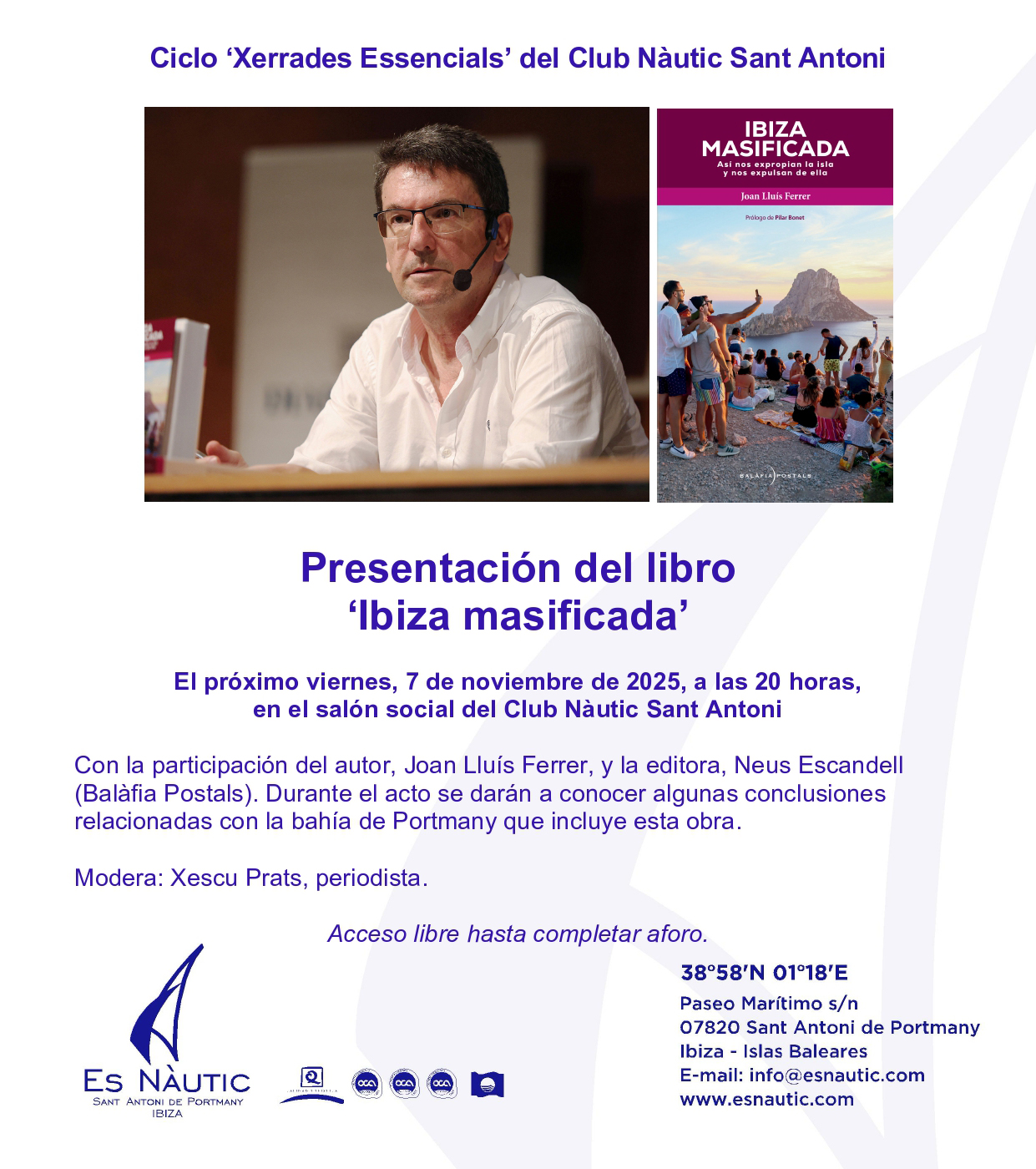 Aquest divendres, 7 de novembre, a les 20 hores, torna el cicle de tertúlies del Club Nàutic Sant Antoni ‘Xerrades Essencials’, que reprèn la seua activitat després de l’habitual aturada per la temporada turística. Durant aquesta primera trobada es presentarà el llibre ‘Ibiza masificada’, obra del periodista eivissenc Joan Lluís Ferrer. L’autor desgranarà els aspectes més importants relacionats amb la badia de Portmany que conté aquesta obra i també intervendrà la seua editora, Neus Escandell, de Balàfia Postals. Moderarà la trobada el periodista Xescu Prats. El públic podrà adquirir exemplars i l’autor els signarà al final de l’esdeveniment.