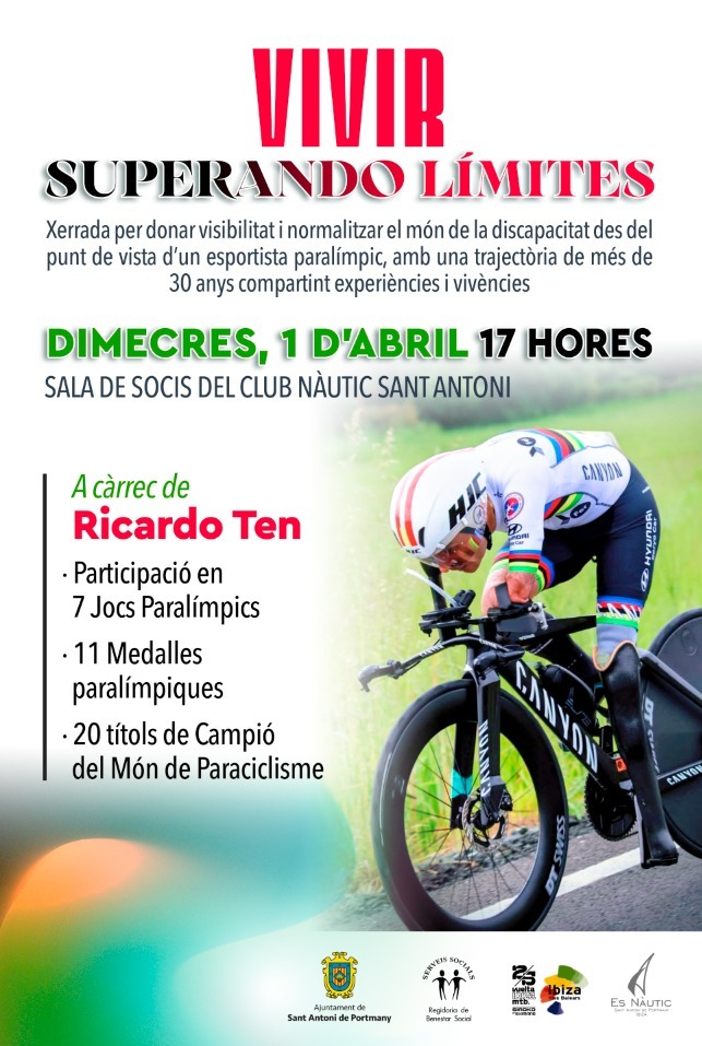 Ricardo Ten, famoso ciclista paralímpico, ofrece este miércoles, 1 de abril, una conferencia de acceso libre en el salón social del Club Nàutic Sant Antoni, que comenzará a las 17 horas. El objetivo de esta charla es dar visibilidad y normalizar el mundo de la discapacidad, desde el punto de vista de un deportista paralímpico, con una trayectoria de más de treinta años. Organiza la concejalía de Bienestar Social del Ayuntamiento de Sant Antoni, en el marco de la XXV Vuelta a Ibiza MTB Siroko by Shimano.